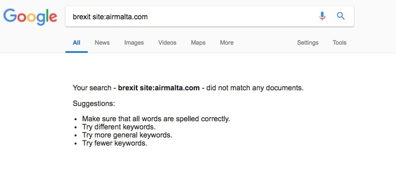 That didn’t look promising, so I searched for Brexit information on the gov.mt domain. I got some results this time but nothing aviation, or Air Malta related.