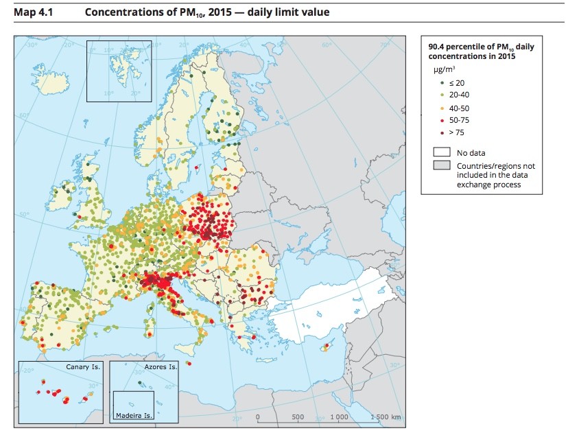 The European Environment Agency monitors pollution levels around Europe. In its annual ‘Air Quality in Europe’ report for 2017, it published a map showing the levels of PM10 around Europe.