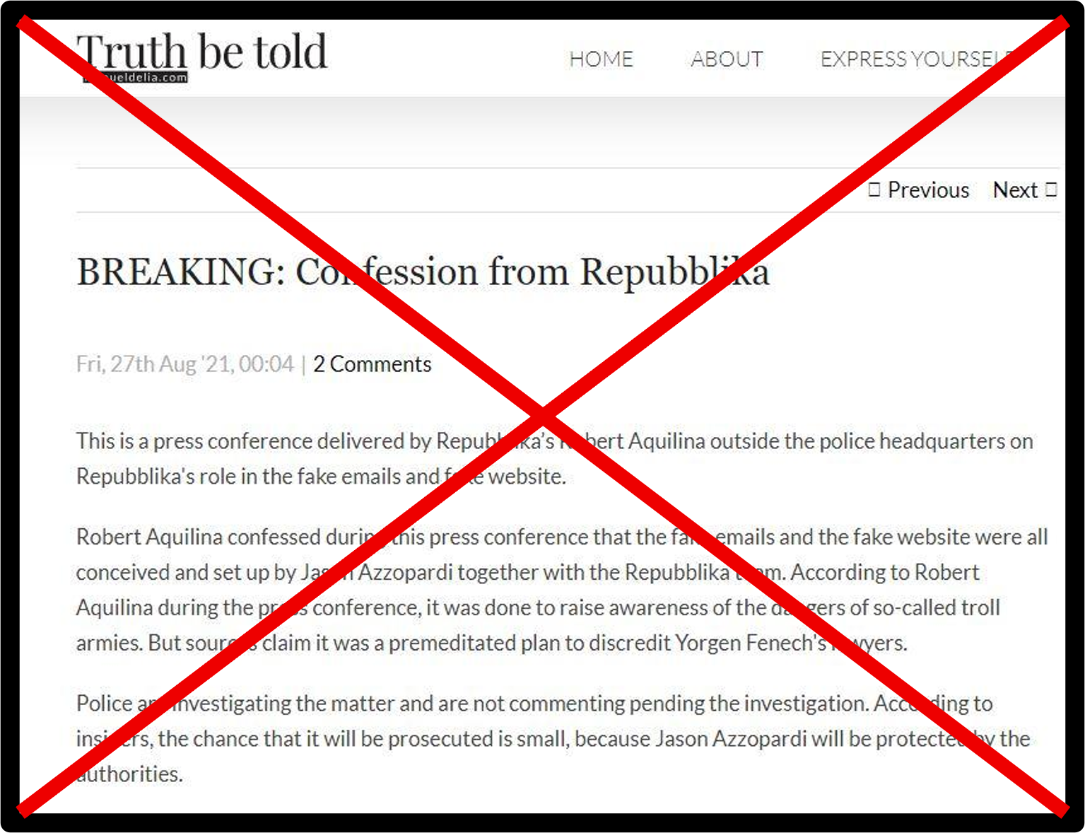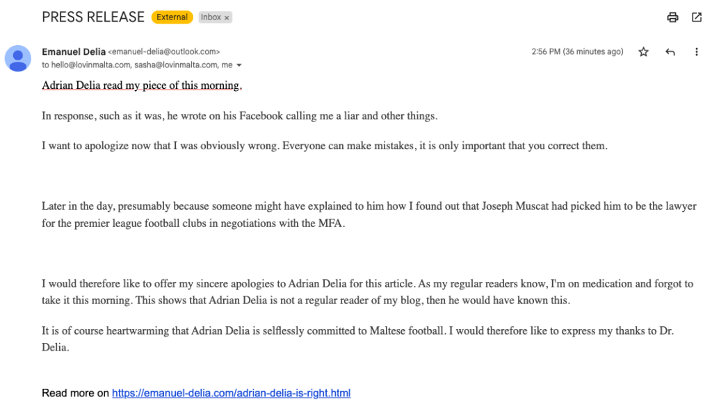 An attempt of spoofing by people masquerading as Manuel Delia, falsely apologising to Adrian Delia over recent claims.