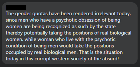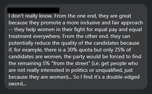 It continues to read that, “Gender quotas do not discriminate against individual men. Rather, quota rules limit the tendency of political parties to nominate mostly men and compel them to seek out active and competent female candidates. For the voters, the opportunities are expanded with the possibility to vote for parties with women candidates.”.