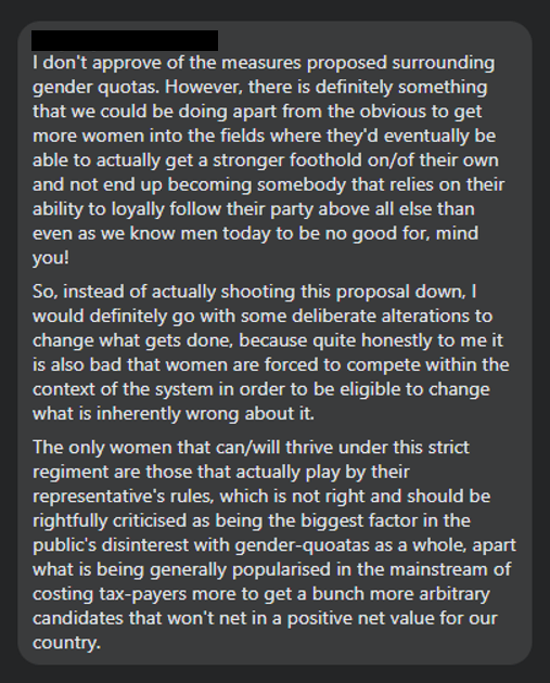 We released a poll last Friday to get an insight on what the general public thinks of this bill. The overwhelming majority, around 80%, voted that they are against the Gender Quota bill, with some notable comments listed below;