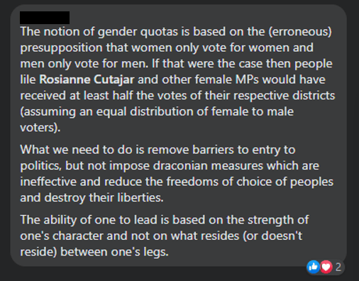 Opponents, on the other hand, state that although it is of extreme importance that Malta has more women in parliament, subjecting them to quotas is degrading to their genuine merits and will subject the members of parliament who get their seat through this bill to be attacked by the media and male politicians who not manage to enter parliament for ‘not being deserving of their position’. This reform would not change any root causes of the issue, but only inflate the female representation in parliament in an artificial manner.