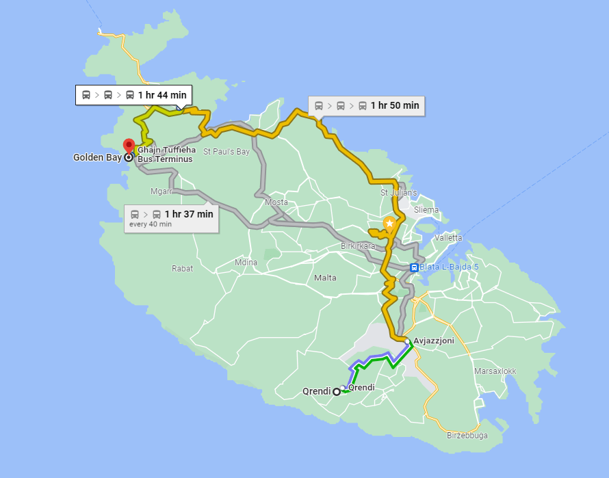 If you managed to board the bus and arrive at Valletta, which takes around 30-40 minutes depending on the traffic, you better hope that the only bus that goes to Golden Bay, Route 44, didn’t leave, as you’d have to wait for a full hour before the next one comes (if it does).