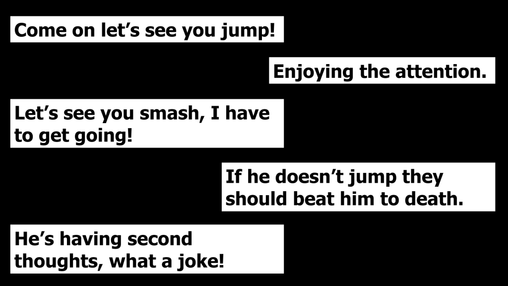 One onlooker was eager to see the man falling to his death, his body squashed against the hard limestone below. This fascination with seeing a man’s corpse splayed open was really the anticipation of seeing how he really felt. Seeing a suicide unfold is so exhilarating to the extent that it is almost unbelievable, like a joke.
