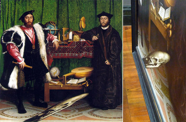 It is like the skull in Holbein’s ambassadors. The painting shows us two men standing behind a deformed human skull. The observer is captivated by the irregular almost horrific โ€˜stainโ€™ the skull is in relation to the ornately depicted men. To give sense to the skull, one has to shift his entire perspective.