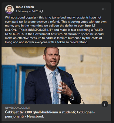 - €100 cheque to all workers, €200 to pensioners as an economic incentive, covering the absolute majority of the voting Maltese population, and more for the more elder voters that are commonly polled as leaning more towards voting for the Nationalist Party, in order to take advantage of the relatively low pension in order to incentivise them into changing sides for the chance of getting more.