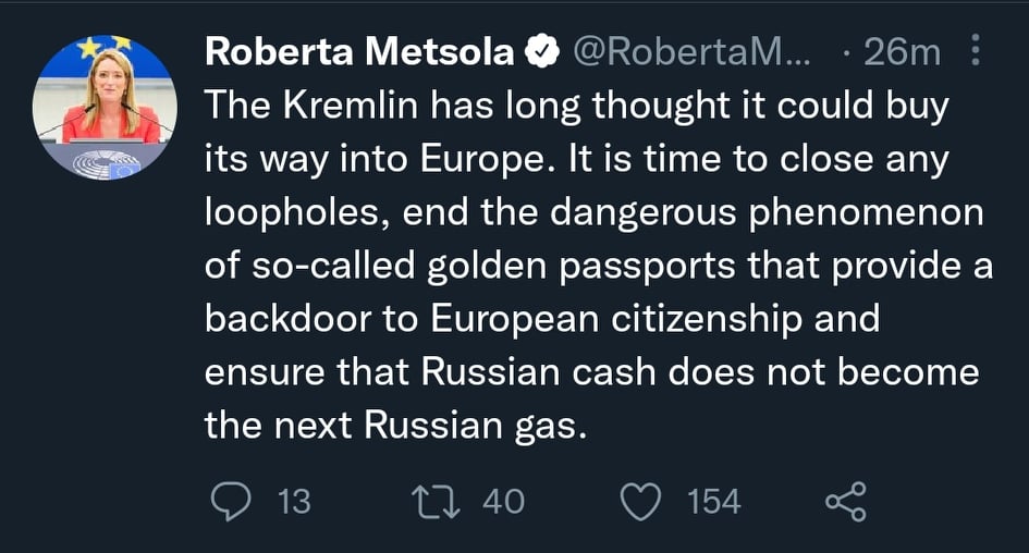 Roberta Metsola, President of the European Parliament, has called for an end to the purchasing of European citizenship through Malta and Cyprus, seen as a way for Russian oligarchs to circumvent current EU and allies’ sanctions.