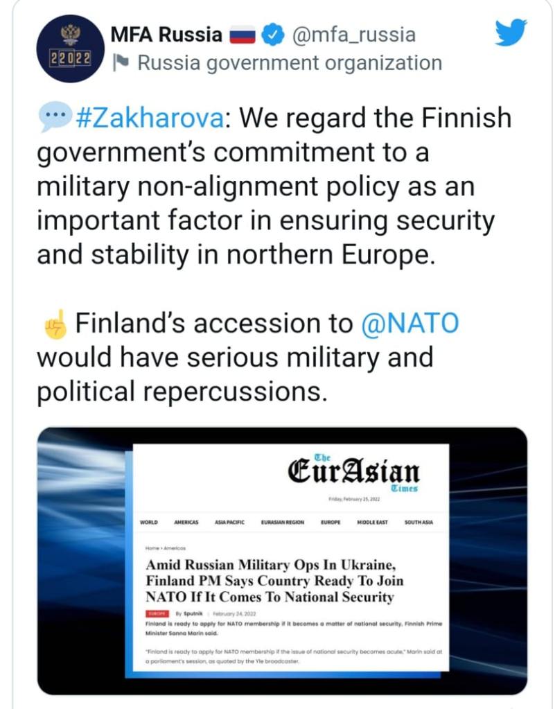 “It’s quite obvious that Finland and Sweden joining NATO… would have serious military and political consequences that would require an adequate response from the Russian side,” said Maria Zakharova, the Russian Director of the Information and Press.