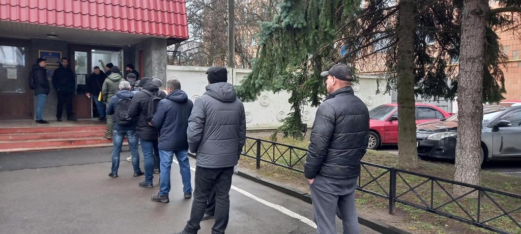 Dozens of men can be seen queueing up to volunteer for the armed forces in several centres across Western Ukraine.