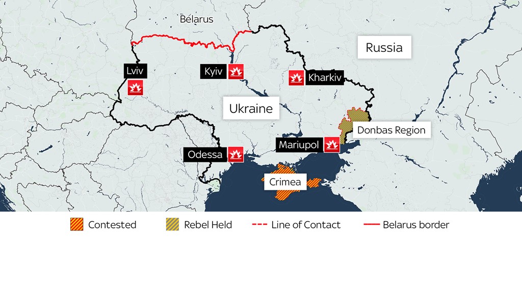 President Volodymyr Zelenskiy, in a TV address, said Russia had carried out missile strikes against infrastructure and border guards. He asked people to remain calm, and demanded Allies take drastic measures to hold Russia accountable.