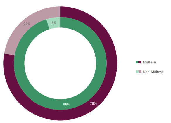 However, this increase does not seem to be coming from the native Maltese population, but from the flood of non-Maltese persons that now reside in the country. Where before this portion of the population made up just 5% of the overall demographic, in just 10 years this number has grown to 22.2%, therefore, accounting for much of this extreme rise of residents on this tiny archipelago.