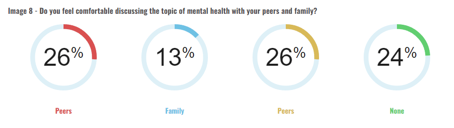 Youths are always at an advantage when it comes to education, as they are more susceptible to search on the internet inform themselves, even through they risk being misinformed. Though Image 88 one can observe that youths are more open to discuss the topic of mental health; whereby 75% of our respondents feel comfortable to speak with either family or peers and a substantial part forming part of the 37% are comfortable to speak with both.
