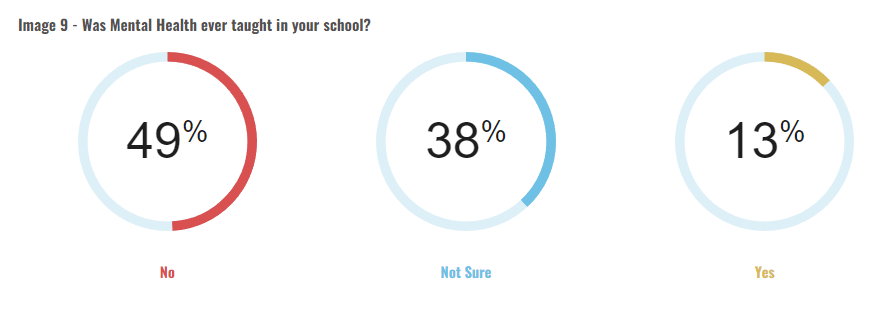 The educational institutions are amongst the most easily accessible venues to educate. In fact, these institutions are equipped to teach a variety of subjects and material. Despite this, little importance is given to educate on the importance of well-being, including mental health. It is worrying, factual result that was extracted from our questionnaire stating that 49% of all respondents where never taught mental health at school, excluding another 38% who are either not sure planned to them in detail.