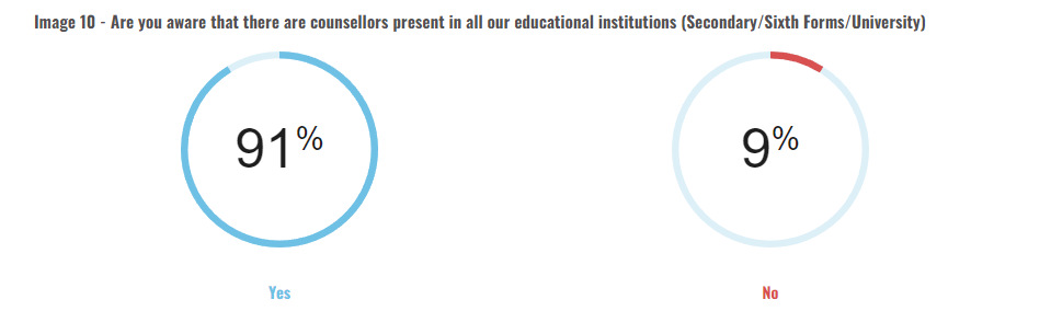 Counselling has proven to be amongst one of the most effective tools in reaching out to youths experiencing difficult situations in schools. According to Image 10 from our total respondents, 90.7% know about the counsellors present at their institution.