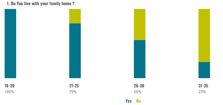 Just under one in ten responders (9%) (Chart 2) who are still living at home, note that this is not by choice. Twenty-three percent (23%) of respondents aged between 31 and 35 agreed that living in their familial home is not by choice. Employed individuals, especially those working full-time, are slightly more likely to want to more out of their familial home.