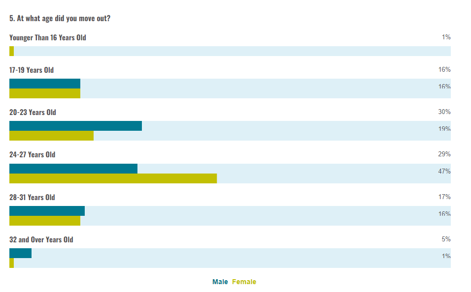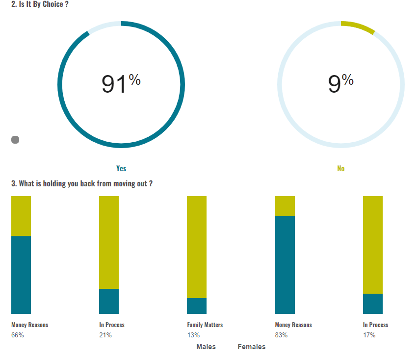 Most respondents (Chart 3), particularly females, point out that financial reasons are holding them back from moving out. 20% of both males and females are currently in transition and 9% cited family issues as being the reason for not moving out. Respondents currently in transition are 26 years old and older.