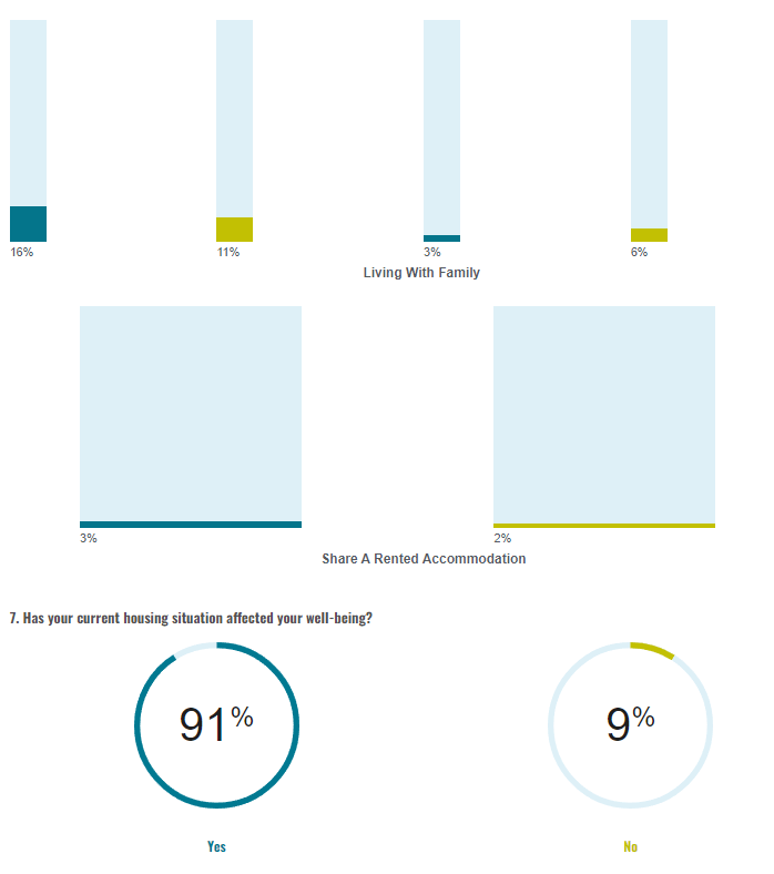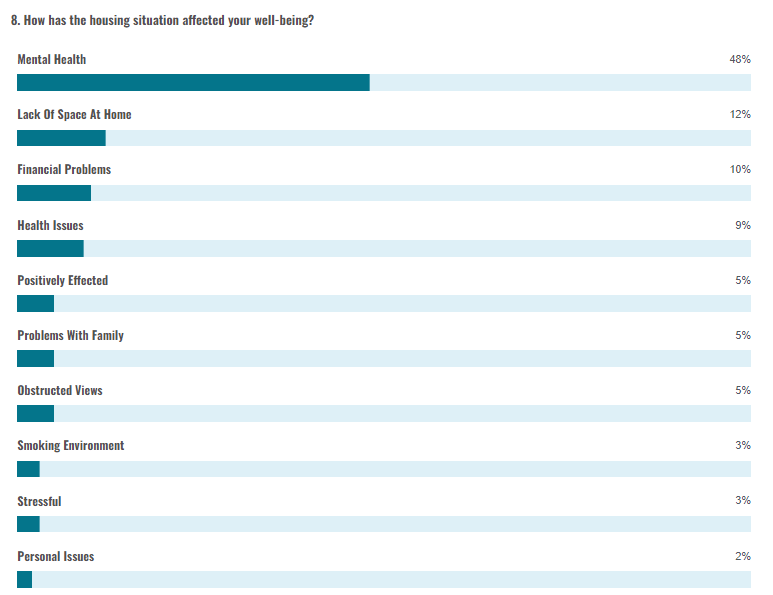 Most respondents (91%) (Chart 7) agreed that their current housing situation has not affected their well-being, Most of the respondents whose well-being has been affected by their housing situation are aged between 26 and 30. Around a quarter of Non-EU nationals (21%) also consider their housing situation to affect their well-being. (48%) (Chart 8) agreed that their mental health has been impacted by their living arrangements. Just one half of the respondents who live in the southern harbor and whose well-being has been impacted noted that this was mostly due to lack of space at home.