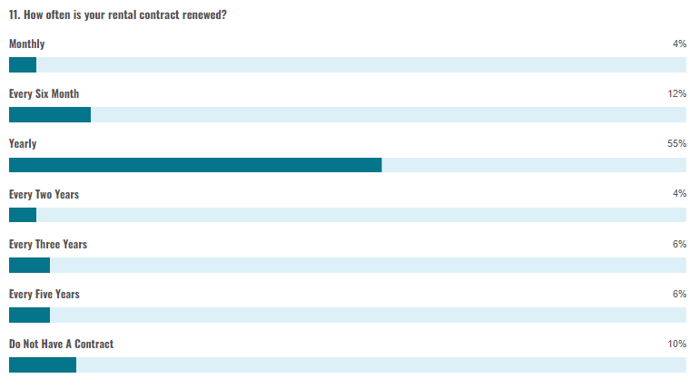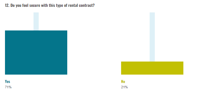 Just under three fifths (58%) of the respondents currently living in a rented property, consider the current rental market stable. The older the respondent, the more likely they are to consider the market to be unstable whereas married individuals are significantly more likely to considerthe rental market stable. (Chart 12) shows how young peoplefeel regarding their contact. One tenth of respondents living in a rented property do not have a contract whereas 55% have a rental contact renewed every year, and 12% renewed every six months. Yearly contracts seems most common amond both maltese and Non-EU nationals, Most of the responders (64%) who do not feel secure with their type of contract, currently have a yearly renewed contract. Males and respondents aged between 31 and 35, are more likely to feel insecure with their contract type.