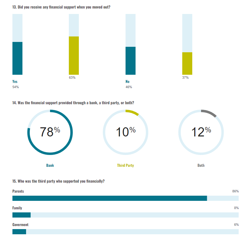 Twenty three percent of those individuals who only received financial support form a third party noted that they had tried to get a bank loan. Over three quarters of respondents (77%) who did not received any financial help when moving out, noted that this was because they did not need it (Chart 16).