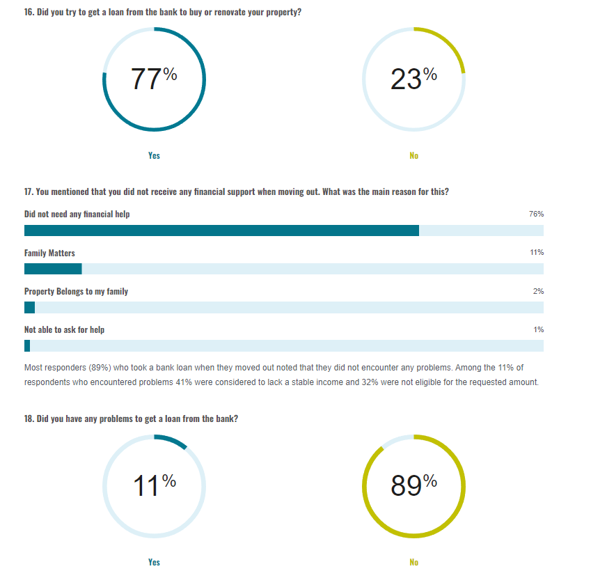 Most responders (89%) who took a bank loan when they moved out noted that they did not encounter any problems. Among the 11% of respondents who encountered problems 41% were considered to lack a stable income and 32% were not eligible for the requested amount.