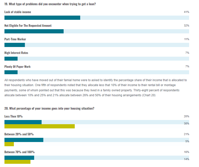 All respondents who have moved out of their famial home were to asked to identify the percentage share of their income that is allocated to their housing situation. One fifth of respondents noted that they allocate less that 10% of their income to their rental bill or montage payments, some of whom pointed out that this was because they lived in a family owned property. Thirty-eight percent of respondents allocate between 10% and 25% and 21% allocate between 26% and 50% of their housing arrangements (Chart 20)