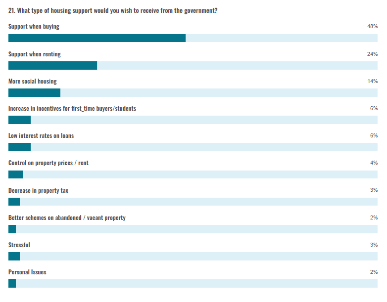 All respondents irrespective of whether living in their familial home or not, were asked to identify any type of support they would like to receive from the Government Chart 21 shows that 48% of respondents noted that they would like support when buying 24% would like support when renting and 14% mentioned more social housing. Almost half of the Gozitan respondents (49%) asked for support when buying and 36% asked for support when renting. Other types of support mentioned include an increase in incentives for first-time buyers/students, lower interest rates on loans and more control on property prices and rent