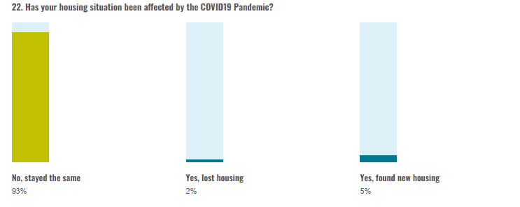 For most respondents (93%) for housing situation has remained the same ever since the COVID-19 pandemic hit. The other 7% of respondents who were affected by the pandemic either lost their housing (2%) or found new accommodation (5%). (Chart 22) Those who lost their housing having a yearly gross income between €10,000 and €30,000. Most respondents (63%) who had to find new housing noted that this was because of self-quarantine. Around one fifth of all respondents whose housing situation was affected by the pandemic (19%) noted that this change was because they could not afford rent since they lost their source of income.