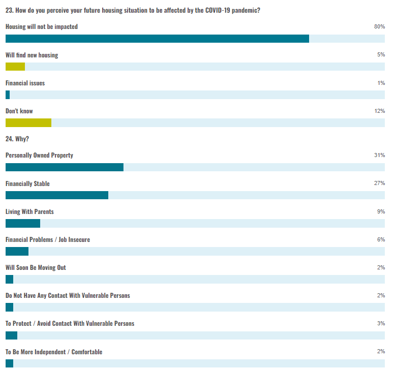 Most respondents have not been affected by the global pandemic to have impacted their future housing situation. Nevertheless there is a small number of respondents who have had to look for alternative accommodation because of the impact of the pandemic. A significant decrease is noted in the percentage of individuals who have not been affected by the pandemic so far and believe they will not be impacted negatively in the future. The reason.