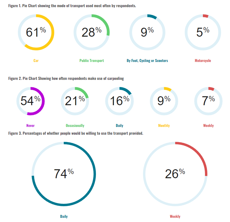 To determine whether such an implementation is viable, a survey was conducted aimed at people who are employed in one of the following industries; Restaurants and Hotels, Office Buildings, STEM Sector, and Shops and Supermarkets. Figure 2 shows that the most commonly used mode of transport is, as expected, by car, at 60.5% followed by Public Transport at 27.9%. Even though the majority use their car, figure 3 shows that 53.5% claim that they never carpool to work, when offered with the possibility of being provided free transport by their workplace, 74.4%, say that they would be willing to make use of this initiative