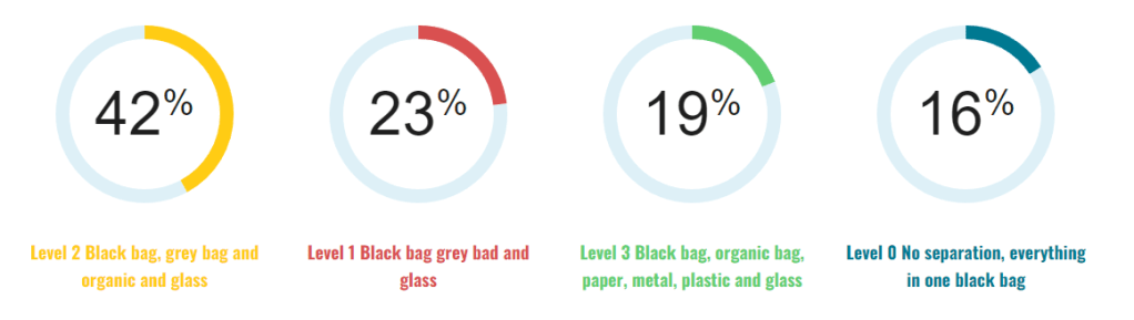 When it comes to businesses, we need to question the responsibilities that businesses have with regards to waste separation, and what level of enforcements is put in place to create a sense of accountability and consequence. It is no secret that big businesses are some of the biggest polluters and should share as much responsibility. While it is easier to have conversation about what the public should be doing to reduce waste, we must not forget that big businesses, play a big role in this discussion. More policies should be put in place that these businesses need to uphold if we ever want to be sustainable. From a survey conducted by this subcommittee on social media aimed at people who work at private businesses, 69.8% said that they word at companies who hire more then 100 people. Figure 1 shows that 18.6% of these companies practice full waste separation and 16.3% do not separate waste at all.