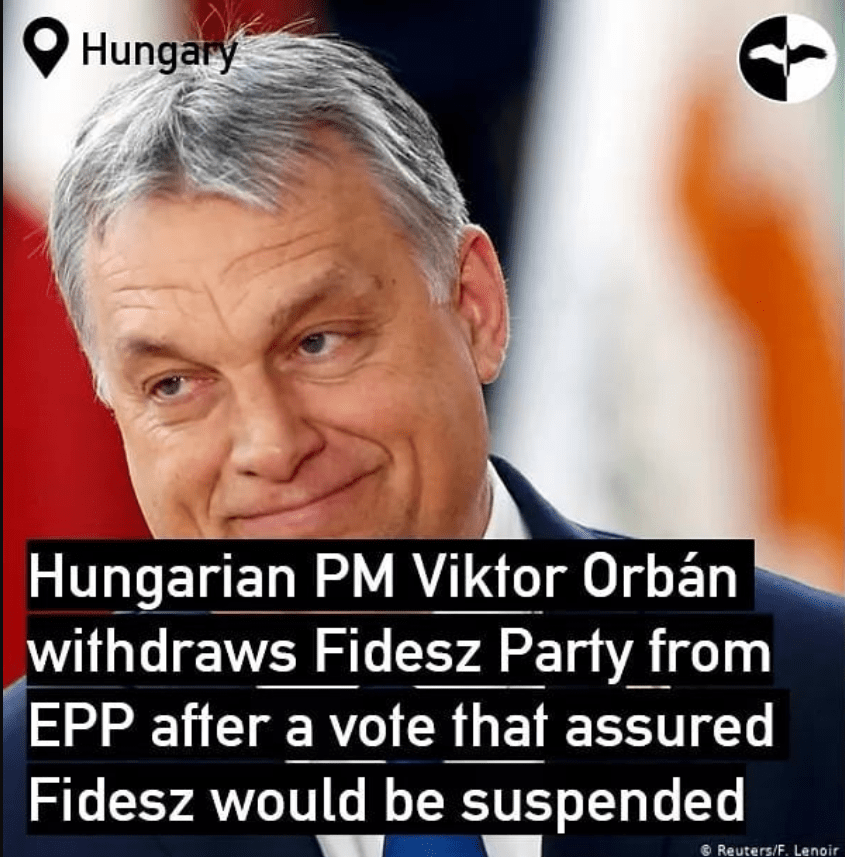 Hungarian Prime Minister Viktor Orbán’s Fidesz party on Wednesday quit the center-right bloc in the European Parliament after a vote that paved the way for it to be suspended or excluded from the group (148 MEPs voted in favor, and 28 against).
