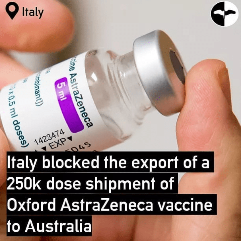 In the first such intervention since the EU introduced new vaccine shipment rules outside the bloc, Rome has decided to prevent the export of 250,000 doses of the vaccine, officials said, as it moves to keep doses inside the union.